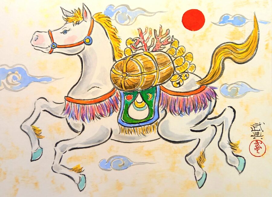 午(うま)年、わたくしはなんと50歳になります。年賀状の作品に描きました「富宝駿馬」は、神の使いである白馬が五穀豊穣の米俵やたくさんの財宝を携え、天空を駆け巡る姿を描きました。わたくしもさらに健康第一に、画業も隆盛できますよう、常に友人知人家族に感謝をし、日々精進いたします。本年もご指導ご鞭撻の程、宜しくお願い申し上げます。